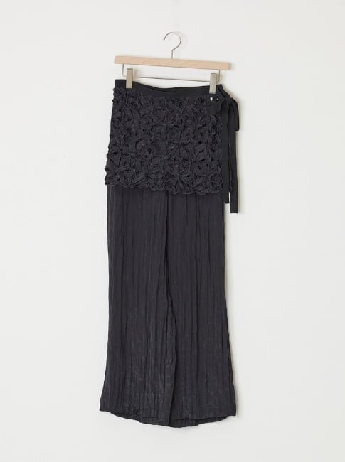 スカートはボトムと同じ生地をテープ状にカットし、加工を施したフラワー刺繍
