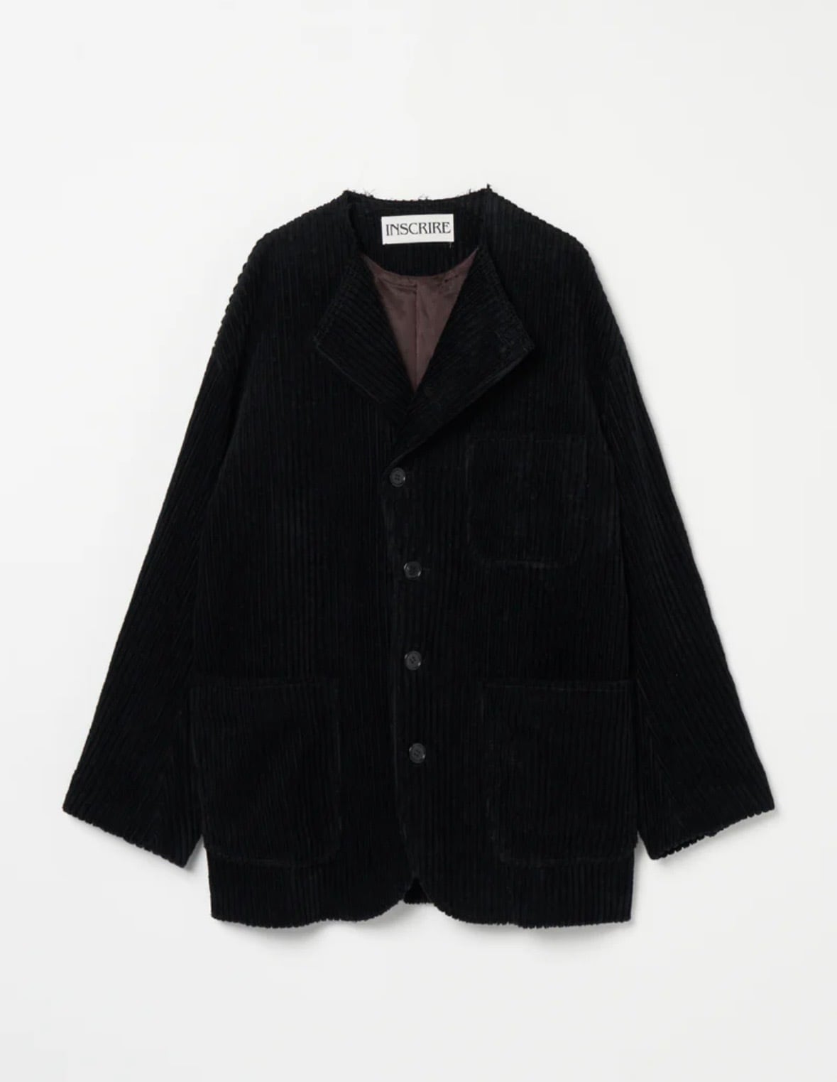 テーラードジャケットの襟を断ち切ったようなデザインで、