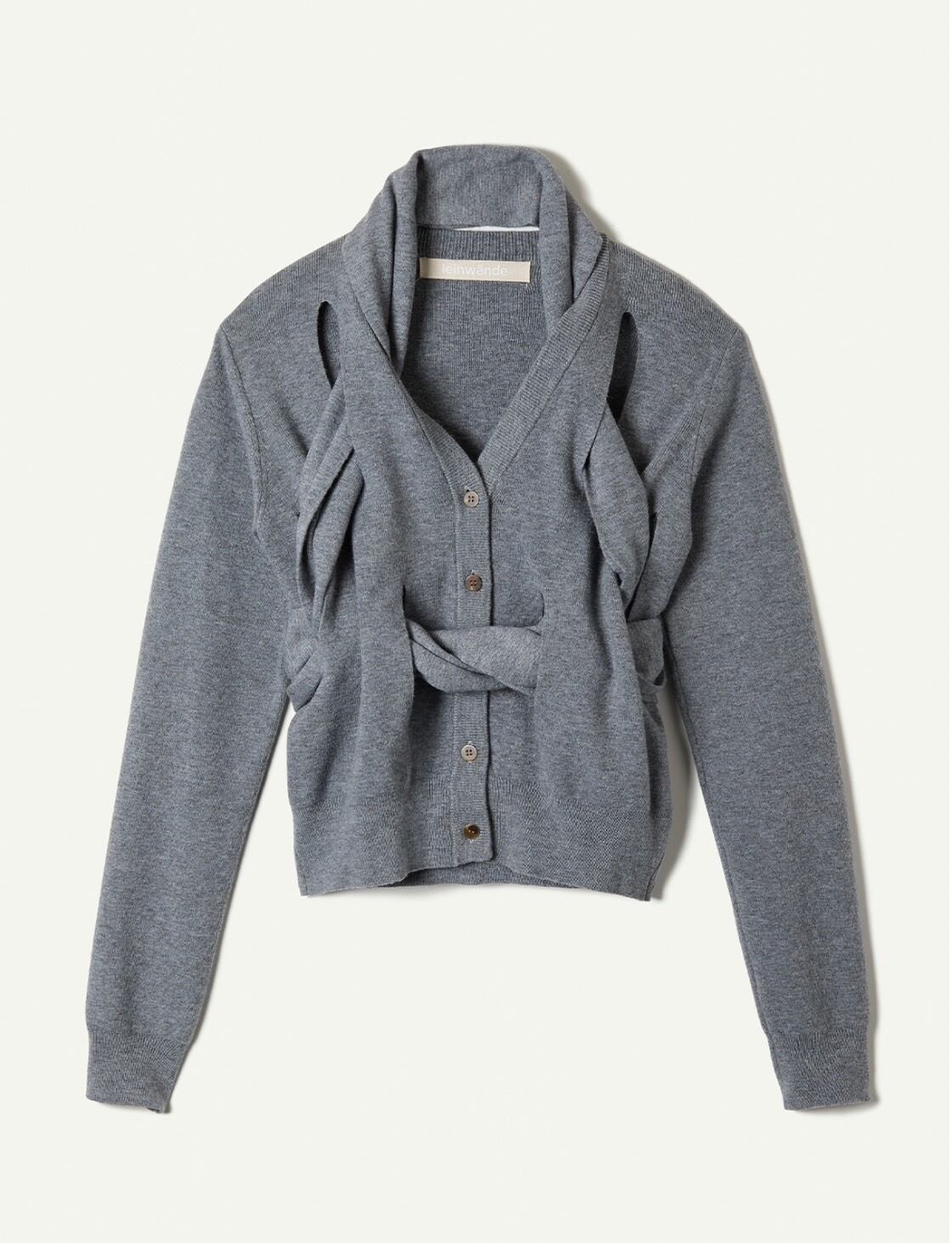 ミニマルなウールカーディガンに、スリットのアクセントを加え、