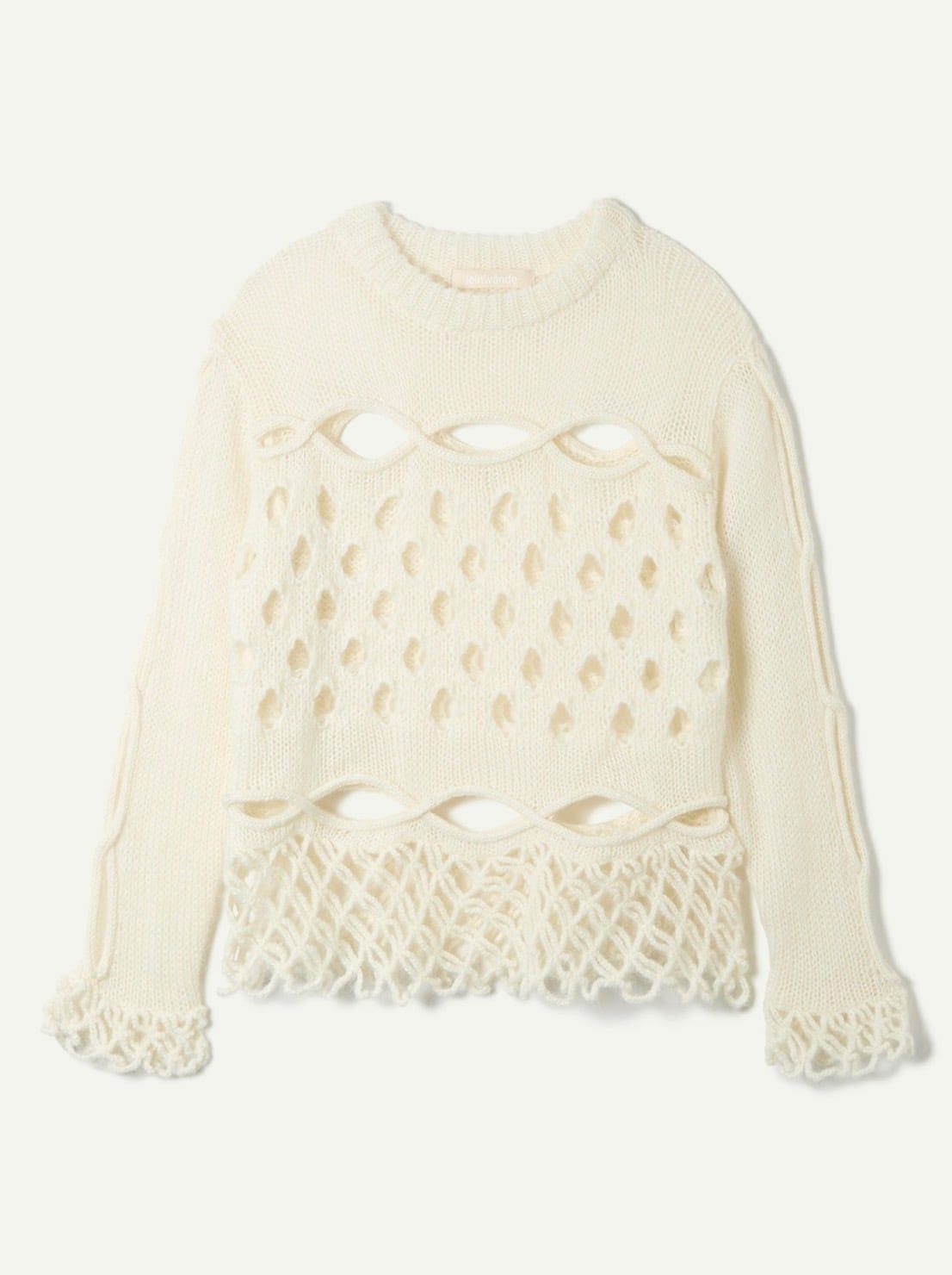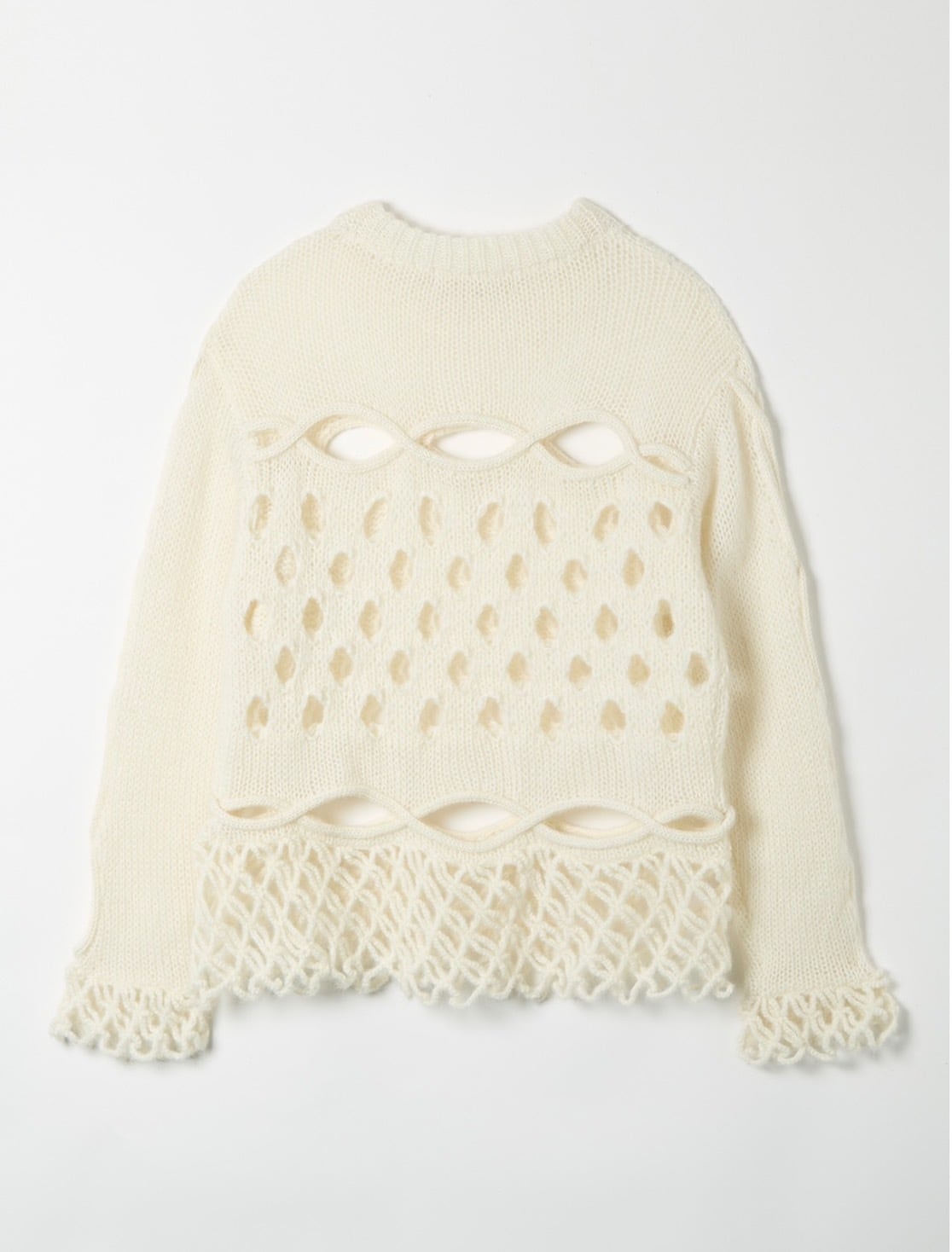 ケーブル編みの網目をたくみにくり抜いたデザインが特徴的なリラックスシルエットのモヘアニット